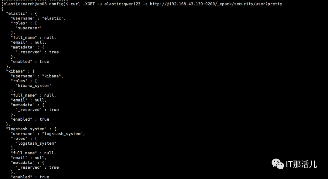 curl -XGET -u elastic:qwer123 -s http://@192.168.43.139:9200/_xpack/security/user?pretty