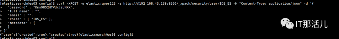 curl -XPOST -u elastic:qwer123 -s http://@192.168.43.139:9200/_xpack/security/user/IDS_ES -H "Content-Type: application/json" -d '{ "password" : "Kms9852HTVdxjzUNXX", "full_name" : "", "email" : "", "roles" : [ "IDS_ES" ], "metadata" : { }}'