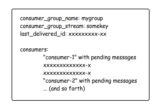 > XPENDING newuser mygroup1) (integer) 152) "1-0"3) "16305704629832-7"4) 1) 1) "consumer1"2) "14"2) 1) "consumer2"2) "1"