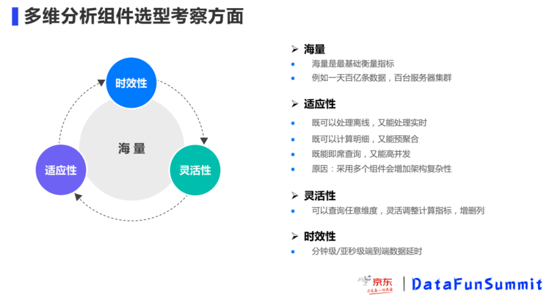 上面我们介绍了OLAP技术在京东一些场景中的难点,基于眼前的这些问题,那么在多维分析中通过哪些考量来做OLAP组件的选型呢?