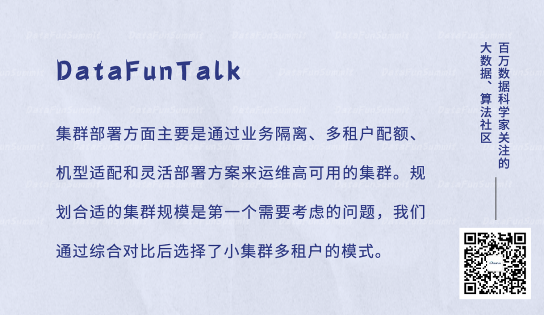 集群部署方面主要是通过业务隔离、多租户配额、机型适配和灵活部署方案来运维高可用的集群。规划合适的集群规模是第一个需要考虑的问题,我们通过综合对比后选择了小集群多租户的模式。集群部署主要有三大模式:大集群、独立集群和小集群。