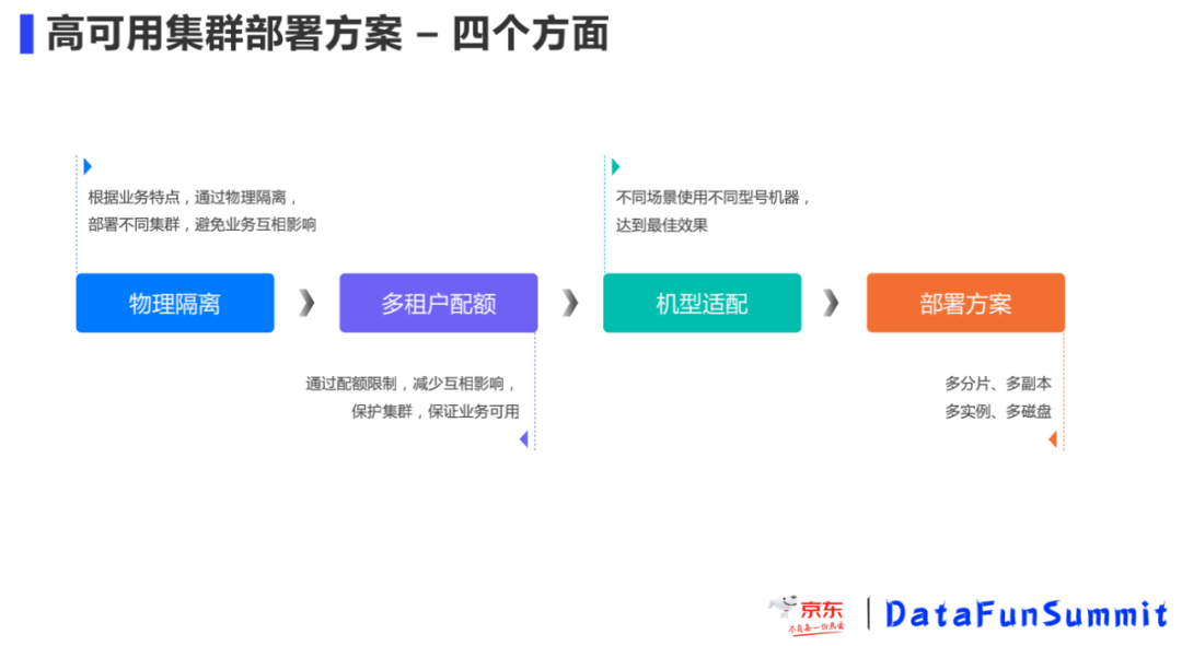 ① 分析性查询和日常报表隔离。分析性查询涉及到大查询和时间跨度比较大的查询,占用大量的资源,可能会影响到其他业务,这两部分业务尽量不要放在一个集群中。