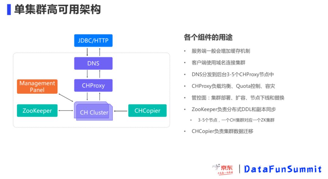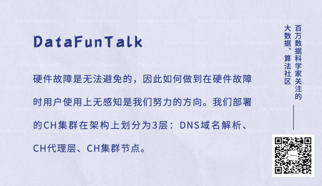 硬件故障是无法避免的,因此如何做到在硬件故障时用户使用上无感知是我们努力的方向。我们部署的CH集群在架构上划分为3层:DNS域名解析、CH代理层、CH集群节点。