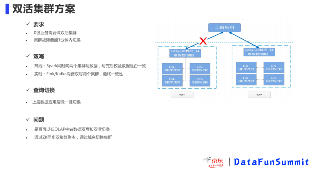 因为双活机房间数据目前离线是通过Spark同时向两个集群写入数据,实时是通过Flink 消费双写两个集群 ,只能保证数据的最终一致性,这种方式对于业务端比较复杂,所以关于能否实现OLAP集群间的双写,通过分布式共识机制同步双集群群副本,通过域名切换集群,这是未来我们要考虑的一个工作。
