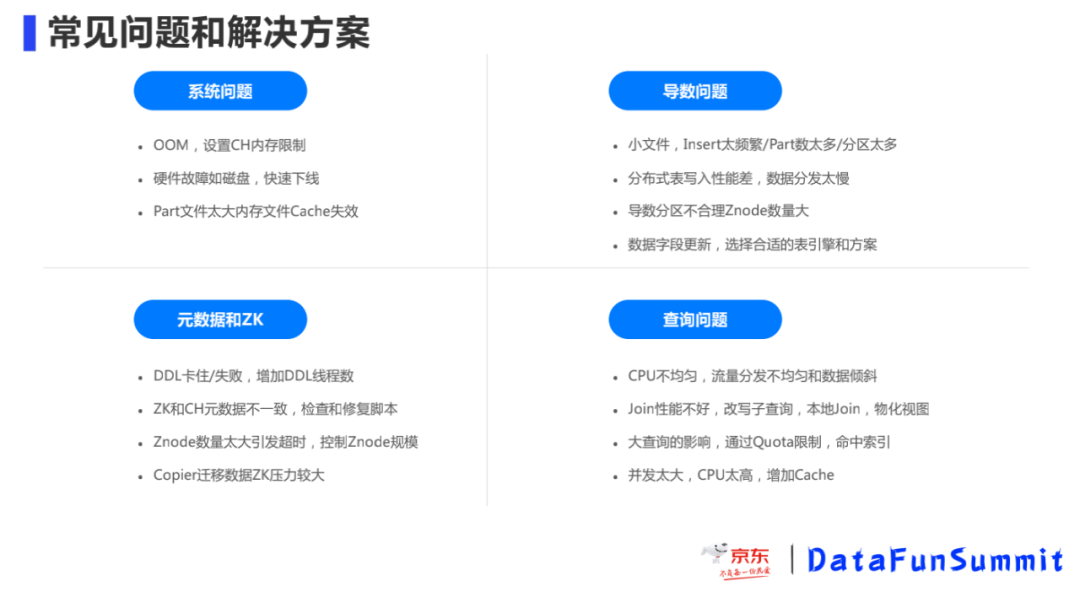 导数问题:Insert太频繁/Part数太多/分区太多都会导致小文件问题;分布式表写入性能差,数据分发太慢;导数分区不合理Znode数量大;数据字段更新,选择合适的表引擎和方案。