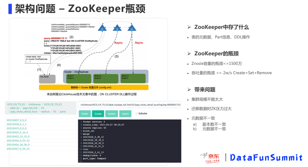 ZooKeeper存在性能瓶颈,ZooKeeper存储了表元数据、副本、Part信息、Merge和Mutation日志以及DDL队列,Znode数量是随文件数量而增长的,如果Znode数量太大,GC时卡顿导致操作延时较大,Znode应当小于2000万左右,吞吐量的瓶颈3w/s左右。理论上,是可以通过不同节点访问不同的ZK集群来分散压力,但是这种方式较为复杂。