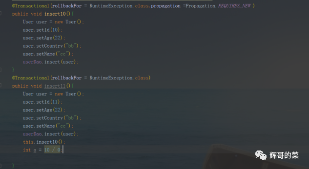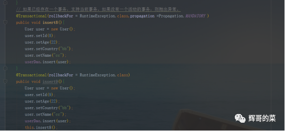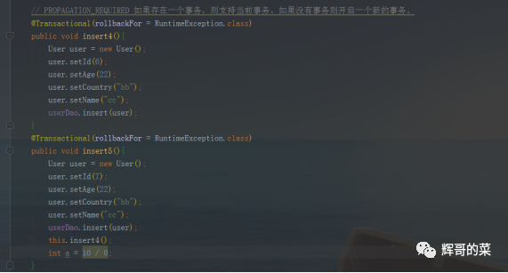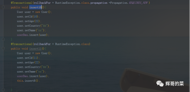 结论:spring的事物需要代理对象才能完成。当同一个类里面的insert11方法调用insert10方法没有起到挂起事物的效果,是因为insert11方法里面是用同对象this调用insert10方法,也就是说,调用insert10方法时候,并没再次生成一个代理类,相当于insert10上面的事物注解就被当做不存在,于是这个insert10方法加入到了insert11的事物里面。而当不同service调用时候,被调用的t2类中insert10方法是通过注入代理调用的,所以它起效果了。