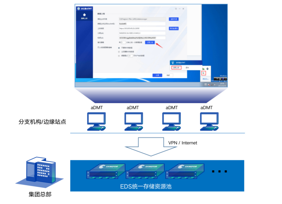 深信服EDS提供aDMT客户端工具,可实现终端数据自动采集,安全上收至统一的存储资源池内,有效解决边缘/分支数据上收难、安全性差的问题。