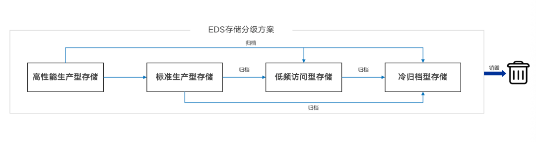 因此,EDS根据以上基本原理区分存储软件、硬件和介质的配置,划分出高性能生产型存储、标准生产型存储、低频访问存储和冷归档型存储,各自特点如下: