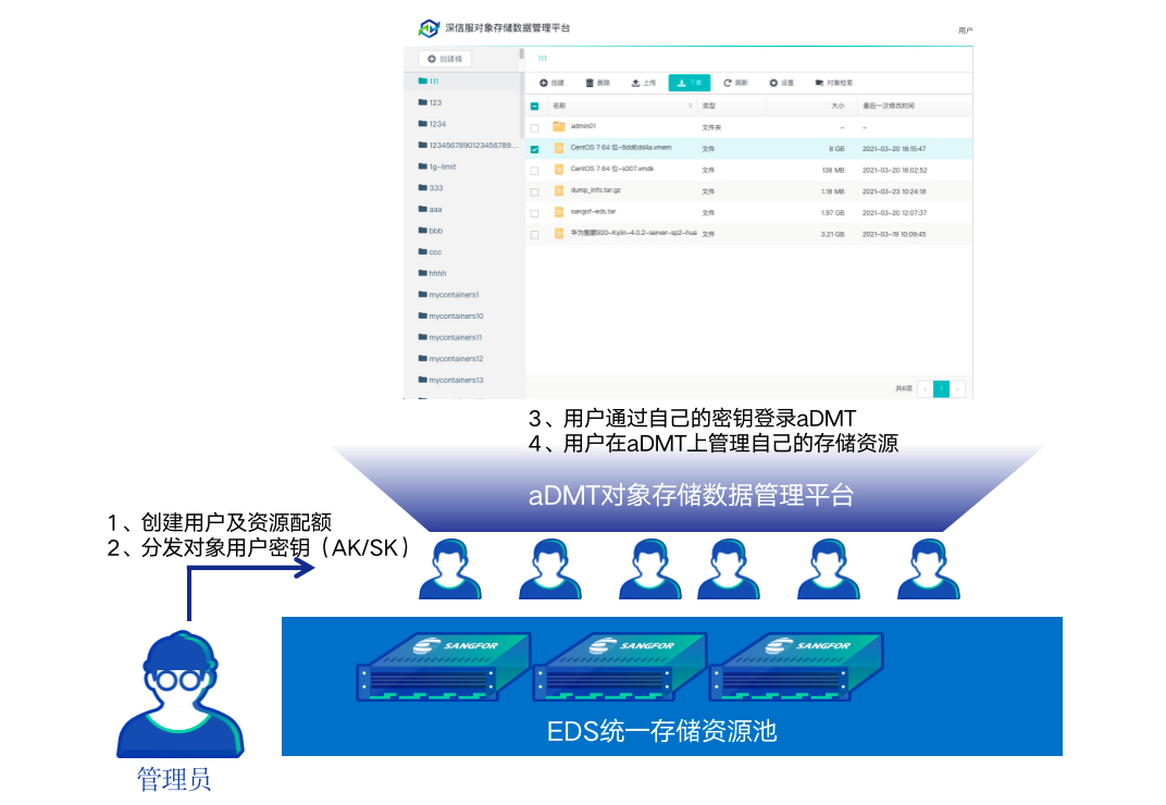 相比于以前存储产品的内部不可知,用户当下更需要对数据存储状态有一个更清晰的掌握,以便做出下一步的业务决策。基于这一洞察,深信服EDS提供aDMT图形化Web应用程序,以便更轻松地访问和管理数据存储。