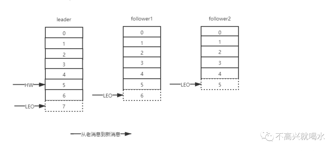 LEO 标识当前日志文件中下一条待写入消息的 offset,它的大小相当于当前日志分区中最后一条消息的 offset 值加1,分区 ISR 集合中的每个副本都会维护自身的 LEO,下图中 leader 和 follower1 以及 follower2 的LEO分别为7,6,5。而 ISR 集合中最小的 LEO 即为分区的 HW。下图中的HW为5,对消费者而言只能消费 HW 之前的消息,也就是5之前的消息。
