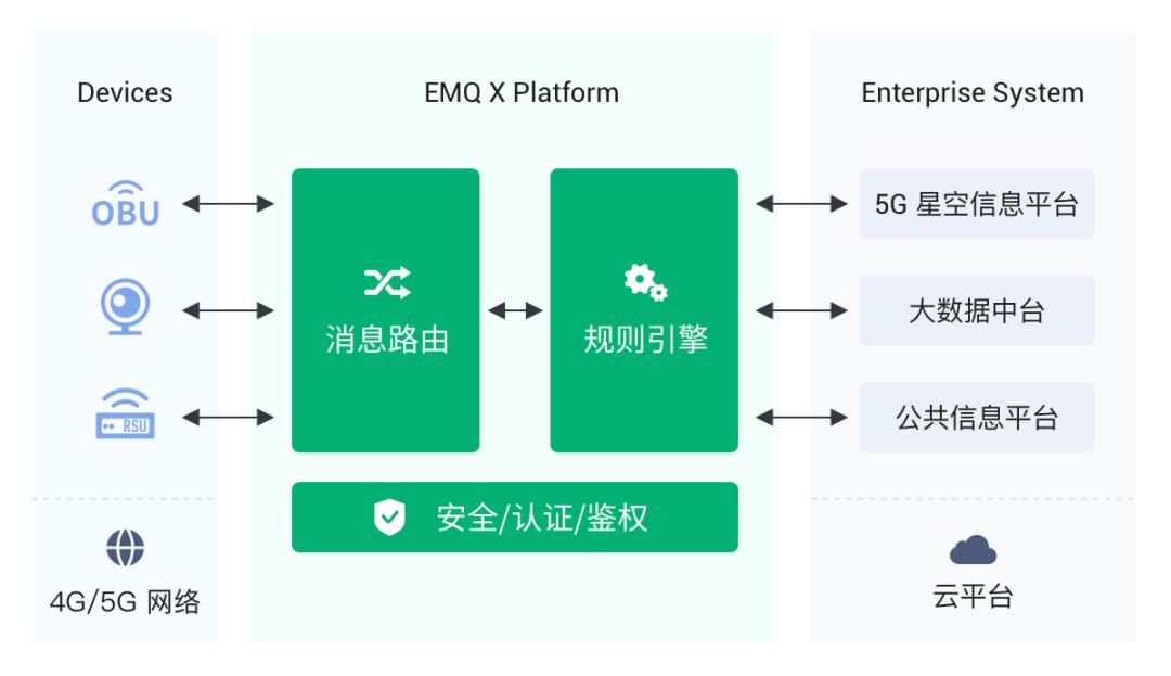 作为实现车路协同的关键,5G + 北斗 + V2X 车路协同方案采用了 EMQ X 消息中间件进行数据消息服务。