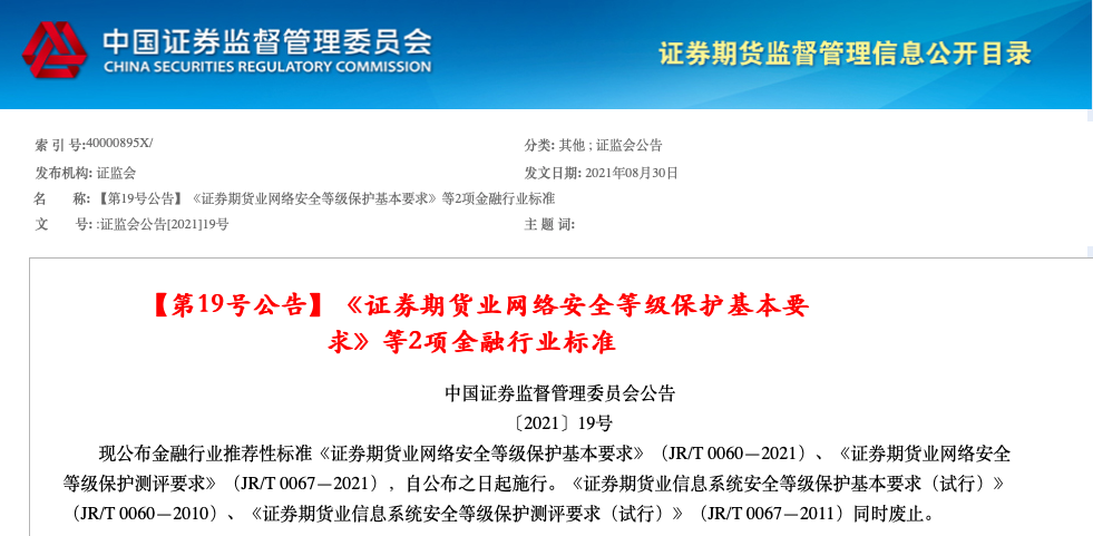 近日,证监会发布《证券期货业网络安全等级保护基本要求》、《证券期货业网络安全等级保护测评要求》2项金融行业标准,自公布之日起施行。《证券期货业信息系统安全等级保护基本要求(试行)》(JR/T 0060—2010)、《证券期货业信息系统安全等级保护测评要求(试行)》(JR/T 0067—2011)同时废止。