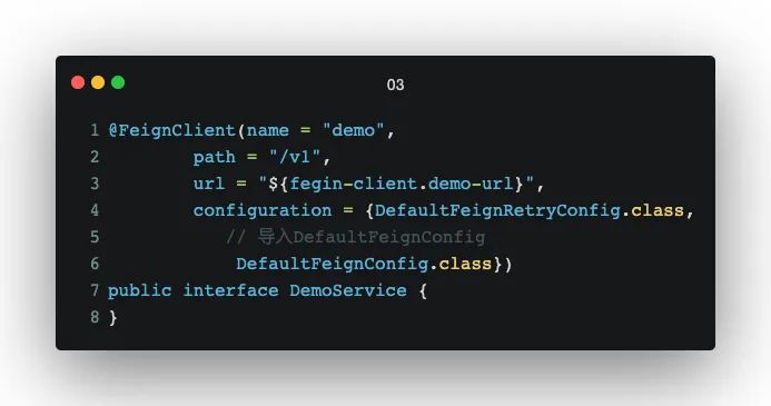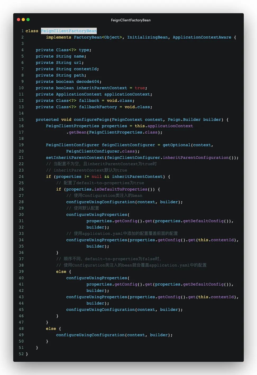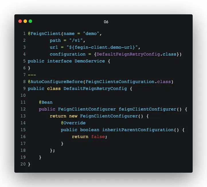 不要在这个配置类上并@Configuration注解,因为这不是注册到应用的ApplicationContext,而是注册到OpenFeign为Client创建的ApplicationContext。