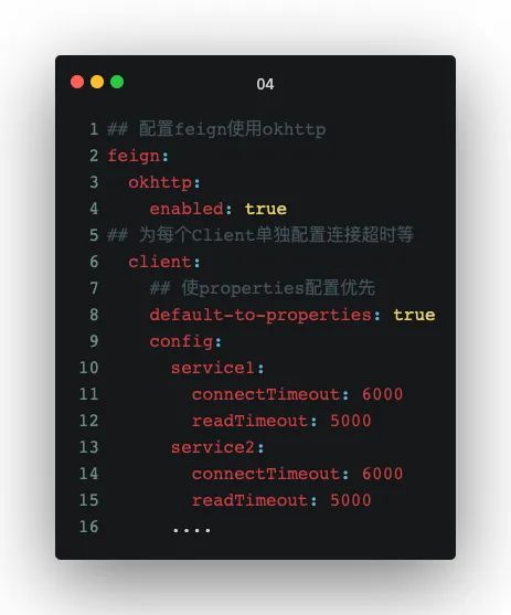 配置连接超时、读超时、重试器、请求拦截器等。支持哪些配置参数可查看FeignClientProperties