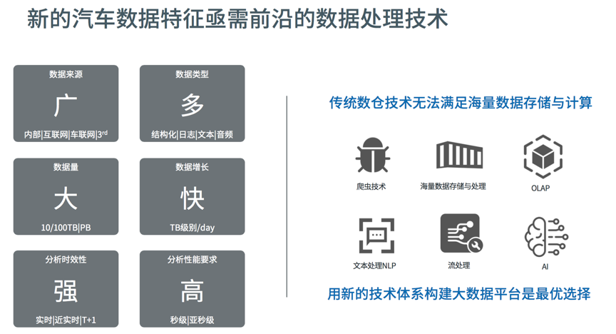 针对上述数据特征,许多企业的架构还是停留在传统数仓的架构体系中,无法做到快速灵活分析;其次数据接入端和数据消费端的技术也在发生变更,传统数仓架构必须要面临着架构升级的趋势。而数据湖技术可以很好得帮助车企解决上述转型中遇到的问题。