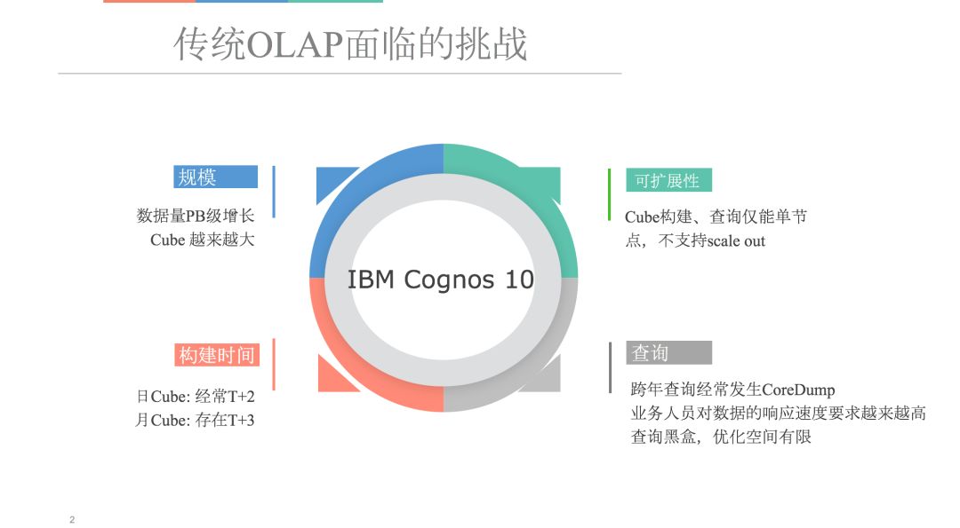 Cognos 从整个功能、架构上来讲, 都是基于单机版的,效率很低;因此我们在 Cognos 的基础上研发了一些工具,包括调度、Cube 刷新,Cube 访问等等,这其中申请的专利就有好几个。这些工具核心还是基于单机的运转,所以说在构建上它的扩展性不好,一个体现是,刷 Cube 的时间越来越长。