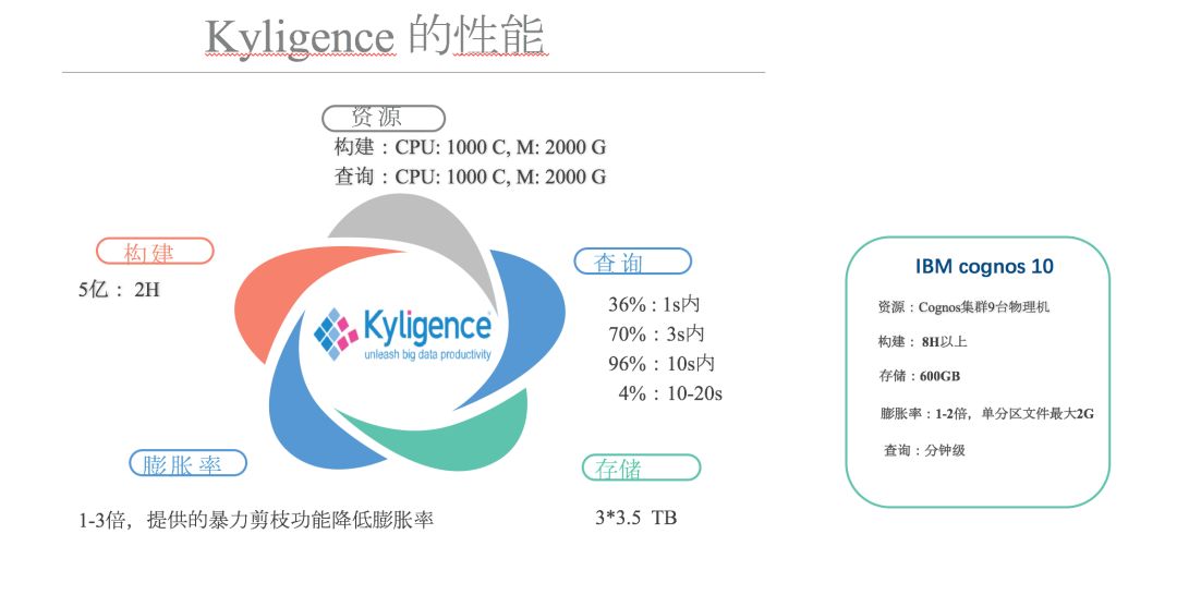 从整个构建性能上来讲, Kylin 相比于 Cognos 也有巨大的提升。因为 Cognos 是单机,没有办法利用分布式集群资源,必须是一个比较独立的 Cognos 在跑,每天跑8个小时以上。Kylin 的构建是在整个大数据平台之上,跟其他的批量计算共享集群资源,这个时候基本上是两个小时左右,就可以把整个 Cube 构建出来。