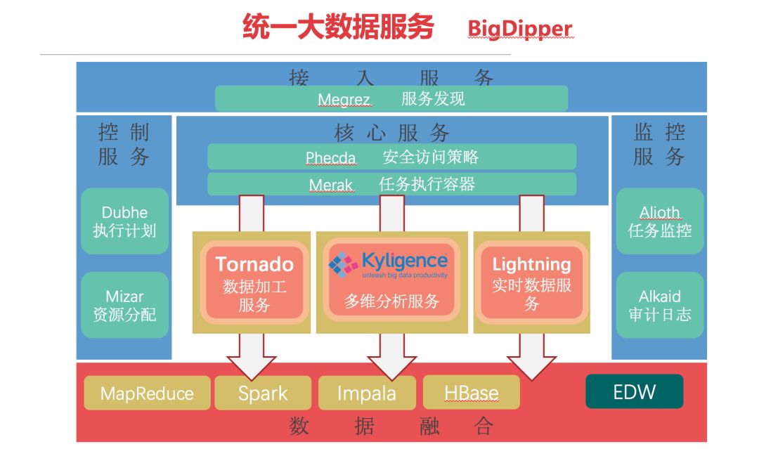 企业内部的大数据围绕着给用户服务,做BI,和数据提取的体系架构。这一圈基本上是自营的一些组件、安全、任务执行、资源控制,任务监控、访问控制;底层是非常熟悉的一系列的大数据套件包括 MapReduce、Spark、Impala、HBase,包括 EDW,所以整个外围的一圈给包在一起,作为一个统一的解决方案提供给用户,用户可以通过各种方式去访问数据、使用数据做自己的分析。