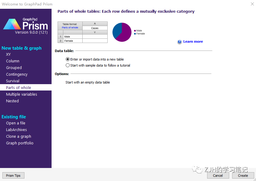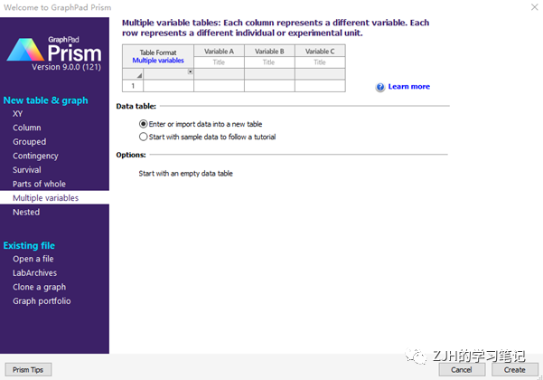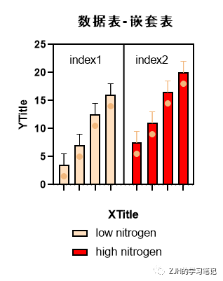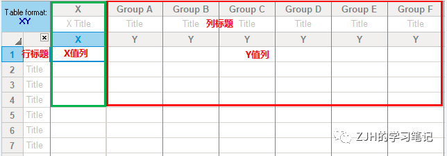 数据表由列和行组成,在大多数情况下,第一列为X值。其余列为Y值,且这些列可被分为子列,用于输入误差条。