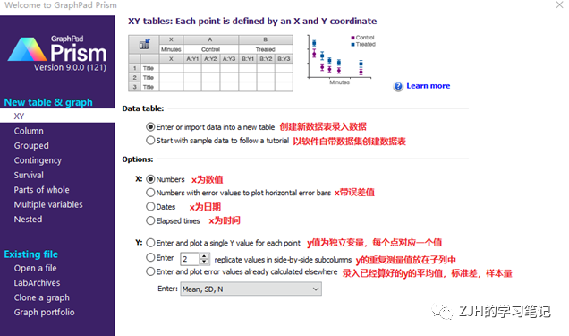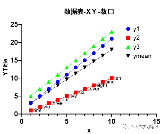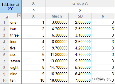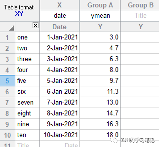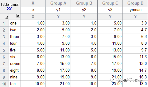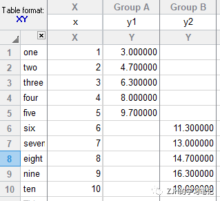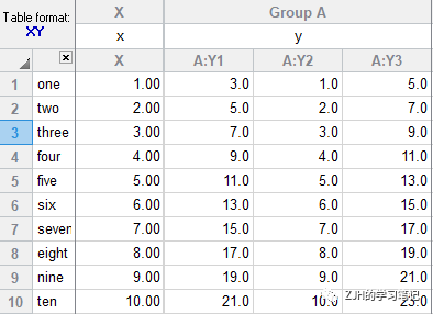 一张XY数据表可以包含256个数据集列和多达256个子列。XY数据表对应的分析多为线性或非线性回归,对应的图一般为散点图,对行进行命名后,就可以在XY图上标记各点。