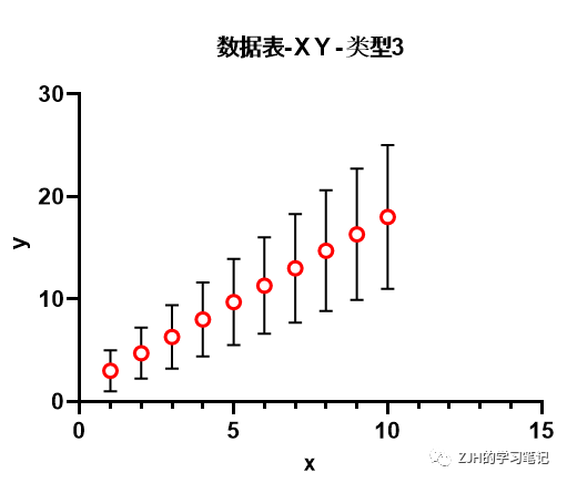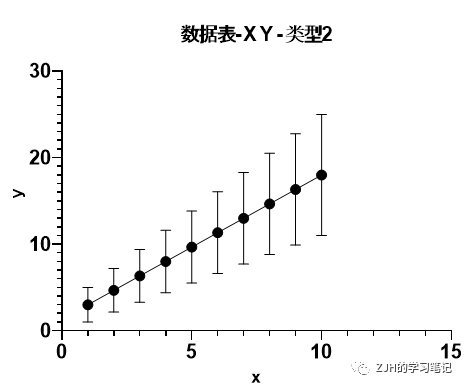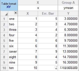 X:Numbers,Y:Enter and plot error values already calculated elsewhere,X为数值型变量,y变量的平均值、标准差、样本量分别录入对应列中。示例数据:
