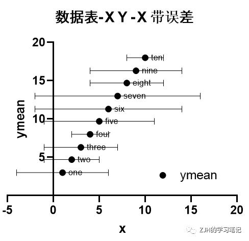 X:Numbers with error values to plot horizontal error bars,输入带误差值的x数据。Y变量为mean。示例数据: