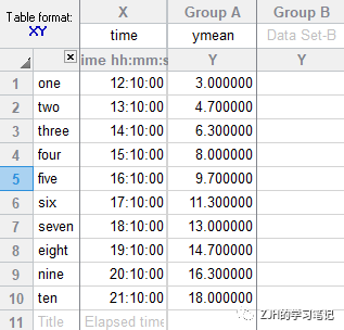 X:Elapsed times,输入时间型x数据。以hh:mm或hh:mm:ss格式输入时间。