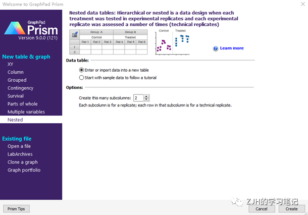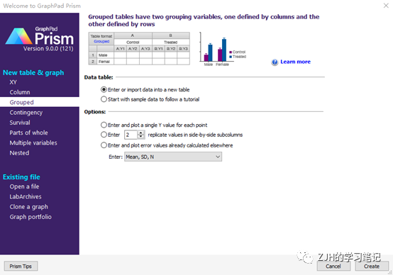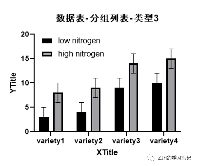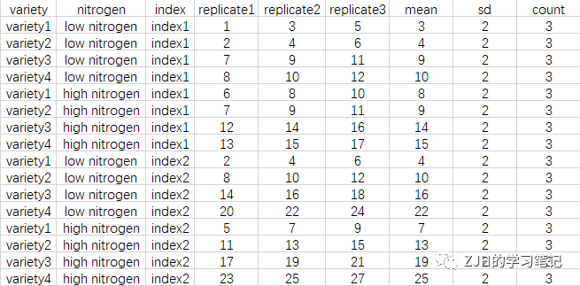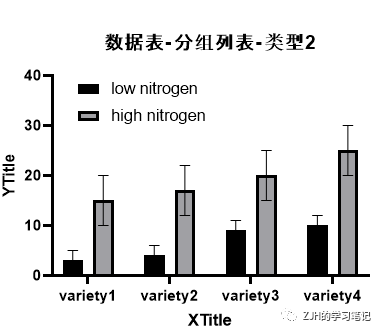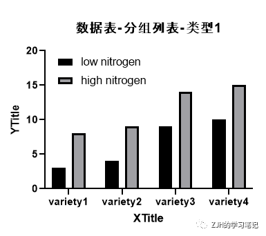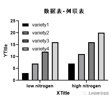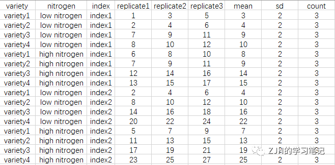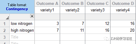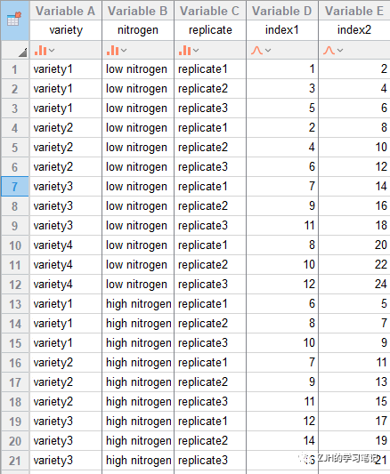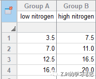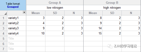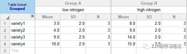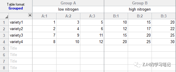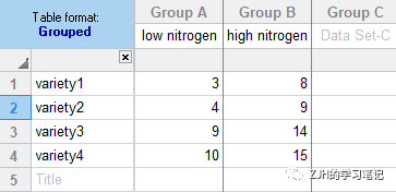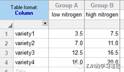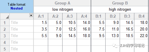 Enter paired or repeated measures data-each subject on a separate row. 当有两个分组时,列来控制1个分组,行来控制另1个分组。示例数据: