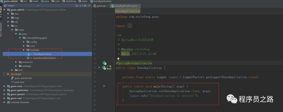 1.SpringBoot main方法启动。子项目guns-admin->main->java->GunsApplication.java,进入Java世界,第一项技能就是运行main方法,这就不多说了。