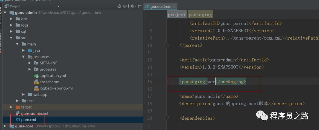 第2,3中方法在idea项目中比较方便。在尝试打包war包时,修改下guns-admin子项目的pom.xml的packaging为war即可。