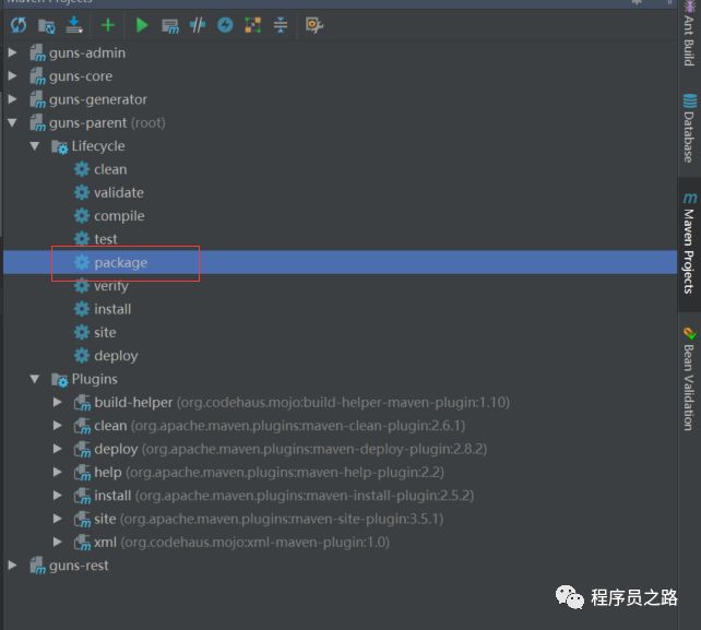 剩下的工作就是在idea的Meven Projects管理窗口找到guns-parent->Lifecyle->package命令即可。