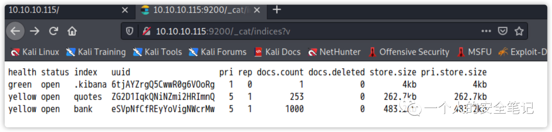 查看返回结果,我们可以查看到 bank 的索引里 1000 条数据,quotes 里的 253 条数据: