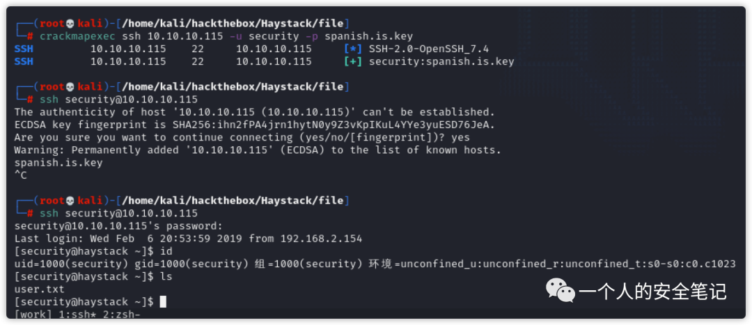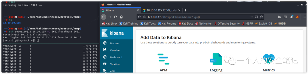 知道是运行着一个Web服务,那么我们可以通过ssh的端口转发,将本地端口转发到其他端口。利用已经获取到了ssh登录账号密码进行本地端口转发:$ ssh security@10.10.10.115 -L 5602:localhost:5601