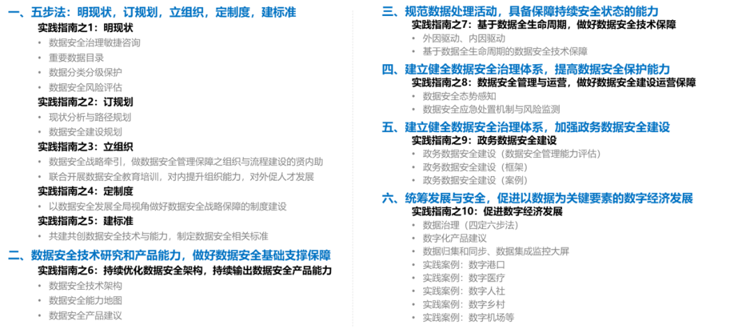 “六大步骤、十大实践指南”贯穿安全治理、规划设计到技术落地,具体涵盖现状梳理、风险评估、数据安全架构、产品技术保障、安全建设运营、数据治理与应用等各个维度。比如: