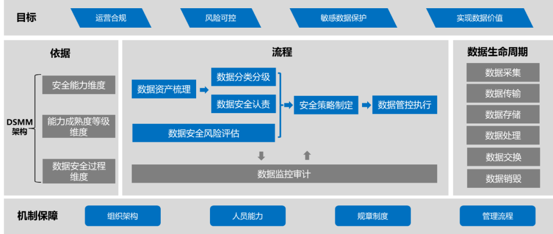 在数据安全管理保障层面:安全建设离不开组织管理的保障,需要建立完善的制度流程、组织架构,同时包保障合理的人员配备,从而更好的推进安全工作落地。