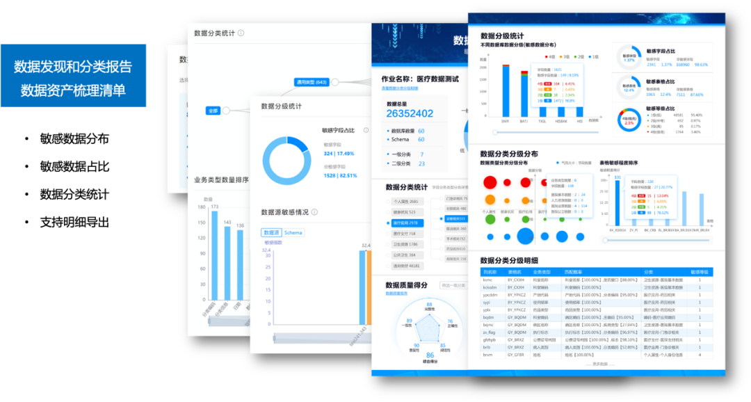 在用户重点关注的数据分类分级保护中,用户实践中普遍存在“无标准难规范,有标准难落地、已落地难应用”的难点问题,美创科技在多年业务实践中形成了一套可操作落地的方法论和配套软件工具,从前期咨询、项目实施和产品沉淀三步实现有效的数据分类分级,并生成可视化的分类分级报告,方便用户筛选和查看不同敏感程度的数据分布和信息。