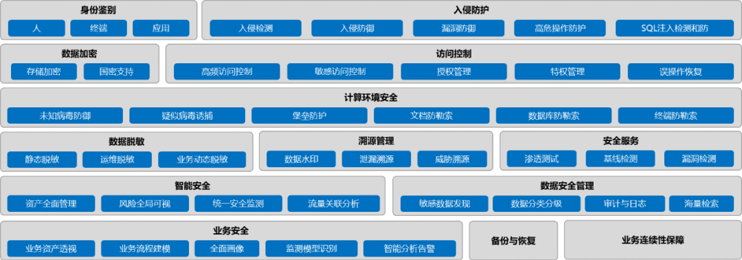 在数据安全基础支撑保障层面:从身份鉴别、入侵检测、入侵防御、高危操作防护等形成一系列数据安全通用能力,更好的支撑安全技术保障。