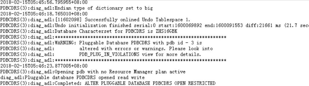 3. 将数据库作为 PDB 插入到 CDB 之后,打开 PDB 时提示为受限模式。