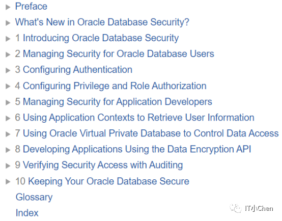 2.4.2,2.4.3,2.4.4,2.4.5部分介绍了更详细的安全管理部分。2.4.2 Advanced Security Administrator's Guide2.4.3 Enterprise User Security Administrator's Guide2.4.4 Label Security Administrator's Guide2.4.5 Database Vault Administrator's Guide