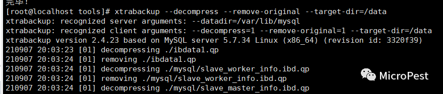 3)xtrabackup --decompress --remove-original --target-dir=/data
