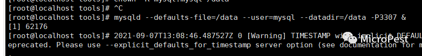 mysqld --defaults-file=/data --user-mysql --datadir=/data -P3307