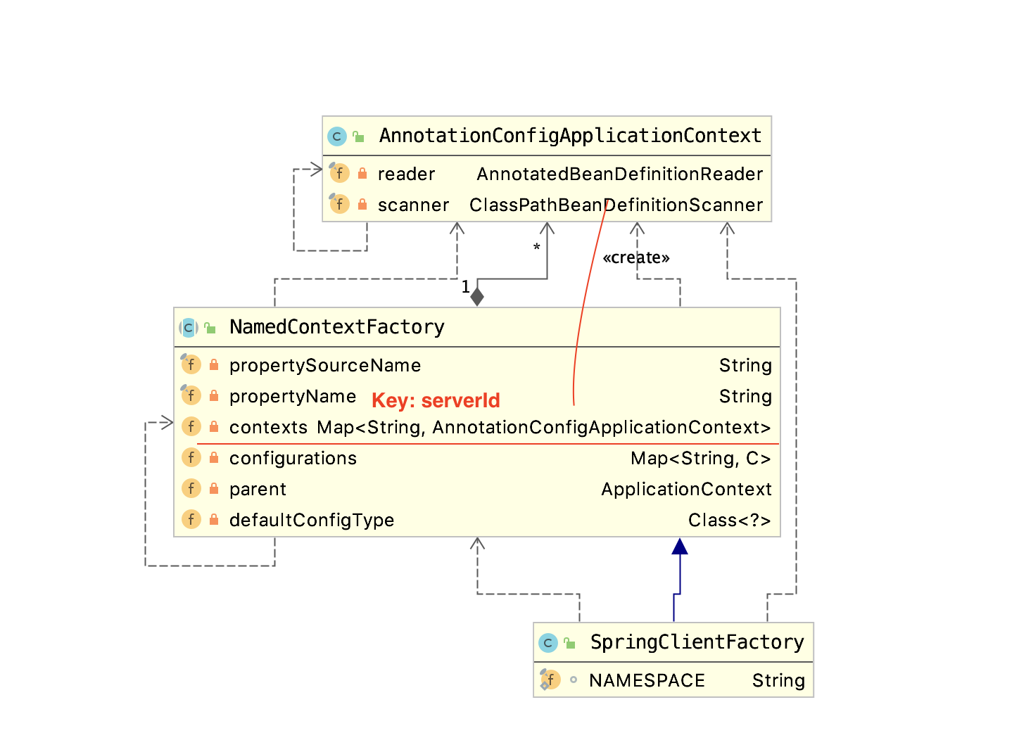 ,用作环境隔离。SpringClientFactory与每个Client的AnnotationConfigApplicationContext的关系如下图所示。