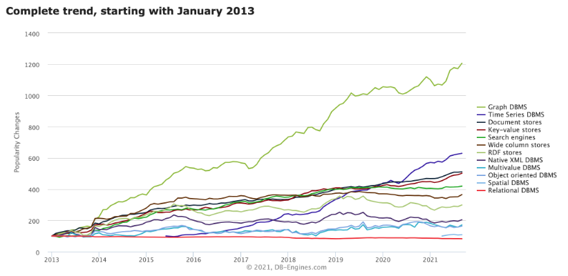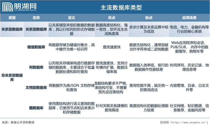 按照存储类型划分,数据库主要可以分为关系型数据库与非关系型数据库。传统的关系型数据库是指建立在关系模型基础上的数据库,借助于集合代数等数学概念和方法来处理数据库中的数据。关系型数据库采用了关系模型来组织数据,其以行和列的形式存储数据。基于「表」的关系型数据库,有着横向可扩展性差、并行处理事务能力较低的缺点。为了满足更多的高并发数据处理需求,以及更多元的数据存储、筛选需求,出现了多种非关系型数据库。非关系型数据库是对区别于传统关系型数据库的统称,也即不依赖于「表」的存储方式的数据库。目前流行的非关系型数据库主要有,键值存储、列存储、文档存储、图数据库等。Gartner 在 2019 年的数据与分析峰会上预测 2020 年以后,全球图处理及图数据库的应用市场都将以每年 100%的速度迅猛增长,《2021十大数据与分析技术趋势》中又提到「到 2025 年,图技术将用于80%数据与分析的创新」。根据数据库流行度排行榜网站 DB-Engines的数据显示,图数据库的关注度增速远超其他类型的数据库。在中国,虽然图数据库的公司成立都只有短短三四年,但均获得了来自顶级VC、互联网巨头、国产数据库巨头的投资。是近年来信创版块最值得关注的赛道之一。图数据库虽然属于「非关系型数据库」,但却是真正注重「关系」的数据库。图数据库起源于20世纪70年代,区别与传统关系型数据库以「表」的方式存储、以「代数」的逻辑计算,图数据库是以「图」的方式存储「图论」的逻辑计算的。图数据库使用节点和边来存储数据库,节点表示实体、边表示实体之间的关系。通过这样的结构通常可以模拟事物之间的关系。图数据库的主要优势在于可扩展性、可阅读性、高效的基于关系查找的能力,以及较好的实时处理能力。图数据库的发展主要来自于企业在存储和计算数据时候对表达数据之间「关系」的需求。在传统以「表」形式表达的数据库中,如果想要增加单条数据与数据之间的关系,则需要横向增加一列,工作非常繁琐;如果想要增加数据属性与属性之间的关系,则几乎无法做到。但在图数据库中,实体与实体之间通过「边」来联系,增加数据与数据之间的联系非常容易。