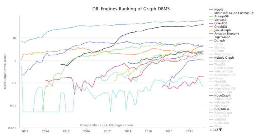 目前主流的图数据库是Neo4j、Cosmos DB,国内以阿里、腾讯为首的互联网巨头,在2018-2020年均根据自己的业务搭建了图数据库产品;
