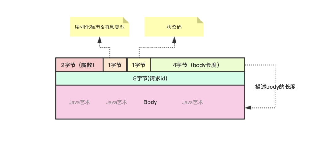 ,标志这是一个dubbo协议的请求或响应数据包;序列化标志就是序列化协议的id,每种序列化协议都对应一个id,比如hession2序列化协议的id是2;消息类型标志这是一个请求消息还是一个响应消息,以及是否事件类型的消息;请求id用于标识一次请求,客户端需要根据这个请求id识别一个响应是哪个请求的回复。