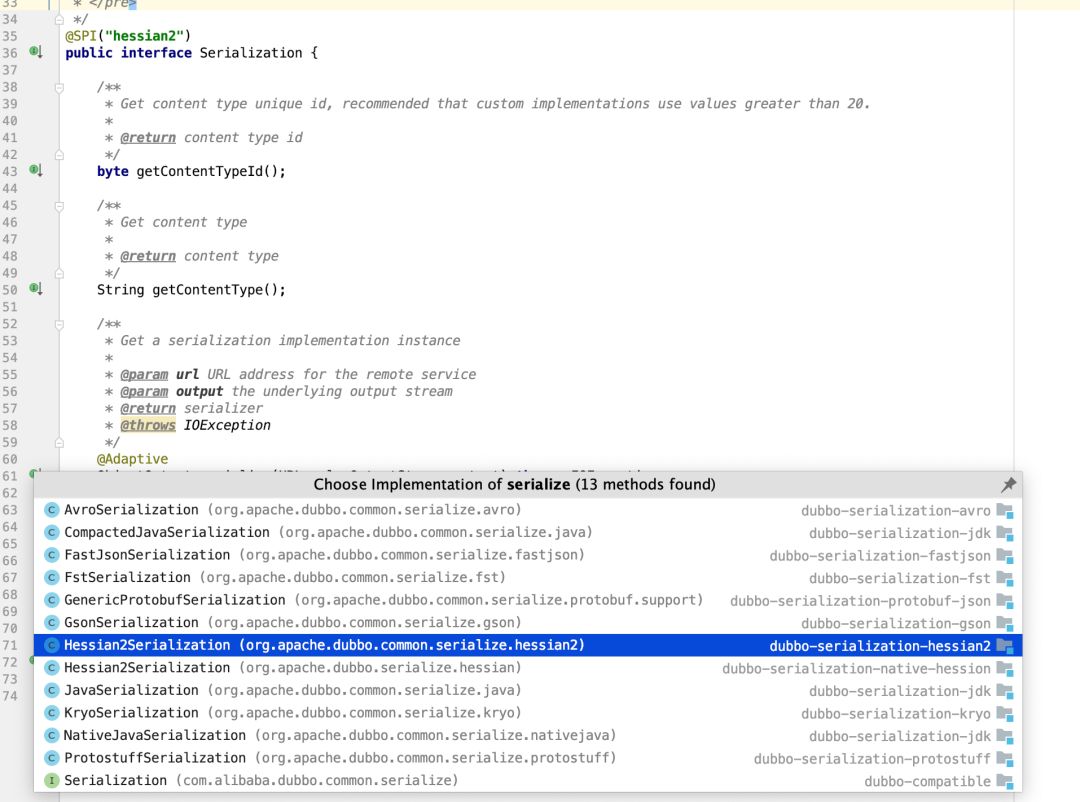 方法完成反序列化操作,序列化和反序列是我们最熟悉不过的,常用的api接口开发使用的就是json协议的序列化与反序列,而dubbo提供了很多种序列化协议的支持,如json、hession2。dubbo会为每种序列化协议分配一个id,使用map做映射,通过id拿到Serialization