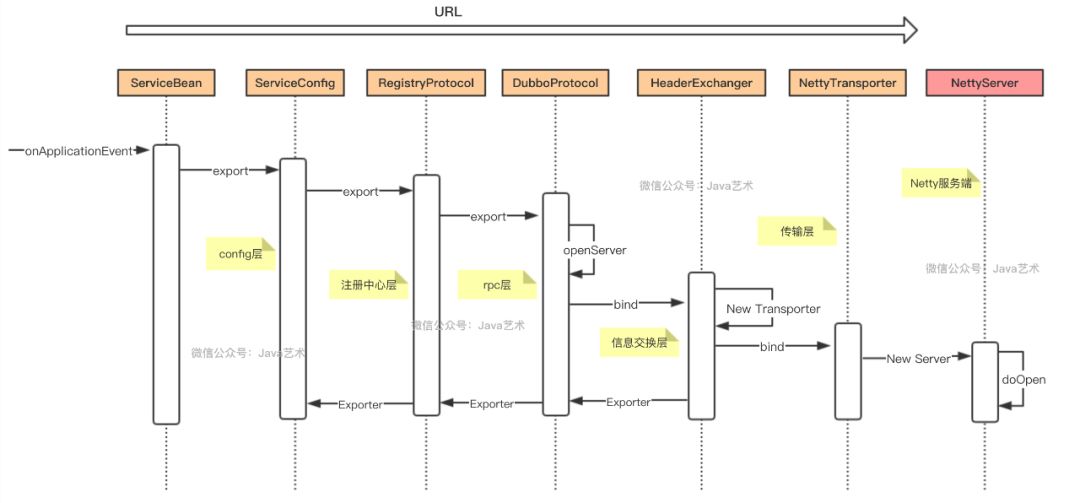 整个服务的导出过程都是由dubbo.URL将配置层、注册中心层、RPC层、信息交换层、传输层串起来的。当前,还有一些细节没有分析到。