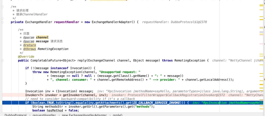 以Debug方式启动demo的服务提供者,再启动服务消费者,在DubboProtocol的requestHandler字段的reply方法中下一个断点,当接收到消费端的请求时,将会停在这个断点。下面分析为什么会停在这个断点。